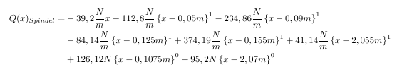 Das Problem ist, dass die Funktion noch nicht so ganz aussieht wie sie aussehen sollte. Der Querkraftverlauf ist mit Föppelklammern dargestellt, das heißt erst wenn der x-Wert in der Klammer größer wird als das, was davon abgezogen wird, dann wird die Klammer ungleich Null. Also noch einmal als Beispiel: Q(0,06)=-39,2*0,06-112,8*0,01