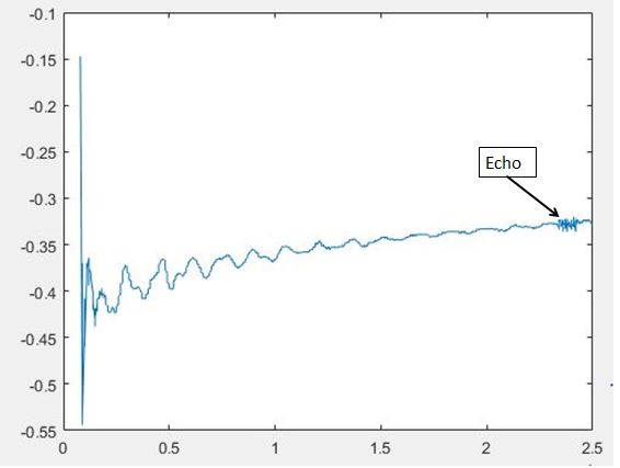 Anschließend überführe ich das gefilterte Signal mittels iFFT in den Zeitraum zurück. Hier soll nur noch das Echosignal deutlich erkennbar dargestellt werden, damit der spätere Anwender eine einfache Abschätzung der vergangenen Zeit durch Betrachtung des Graphen durchführen kann. In der Endfassung würde ich gerne so einen Verlauf haben der dem Schwingungsverlauf im Bild "Echo_Literatur" in einem gewissen Rahmen entspricht.