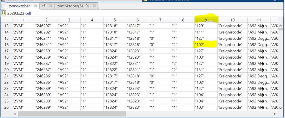 Ich habe hier mal ein Bild mit angehängt wie die Datei in Matlab aussieht, vielleicht hilft das weiter. Ich war nämlich bisher auch nimmer nur so weit, dass er nichts findet, aber es sist die 102 ja wirklich in der Spalte....irgendwie funktioniert da noch was nicht richtig....
