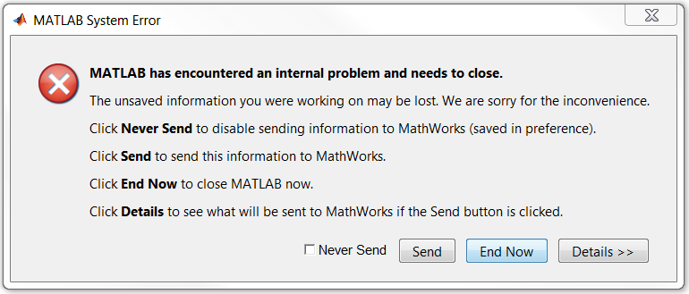 nachdem ich den AppDesigner über "appdesigner" im Command Window geöffnet habe, kommt zuverlässig nach 1-2 Minuten die angehängte Error Message. Wenn ich sie bestätige schließt sich MATLAB und ich kann nichts speichern. Ziehe ich sie jedoch einfach weg und missachte sie, kann ich sowohl den App Designer als auch MATLAB normal nutzen.