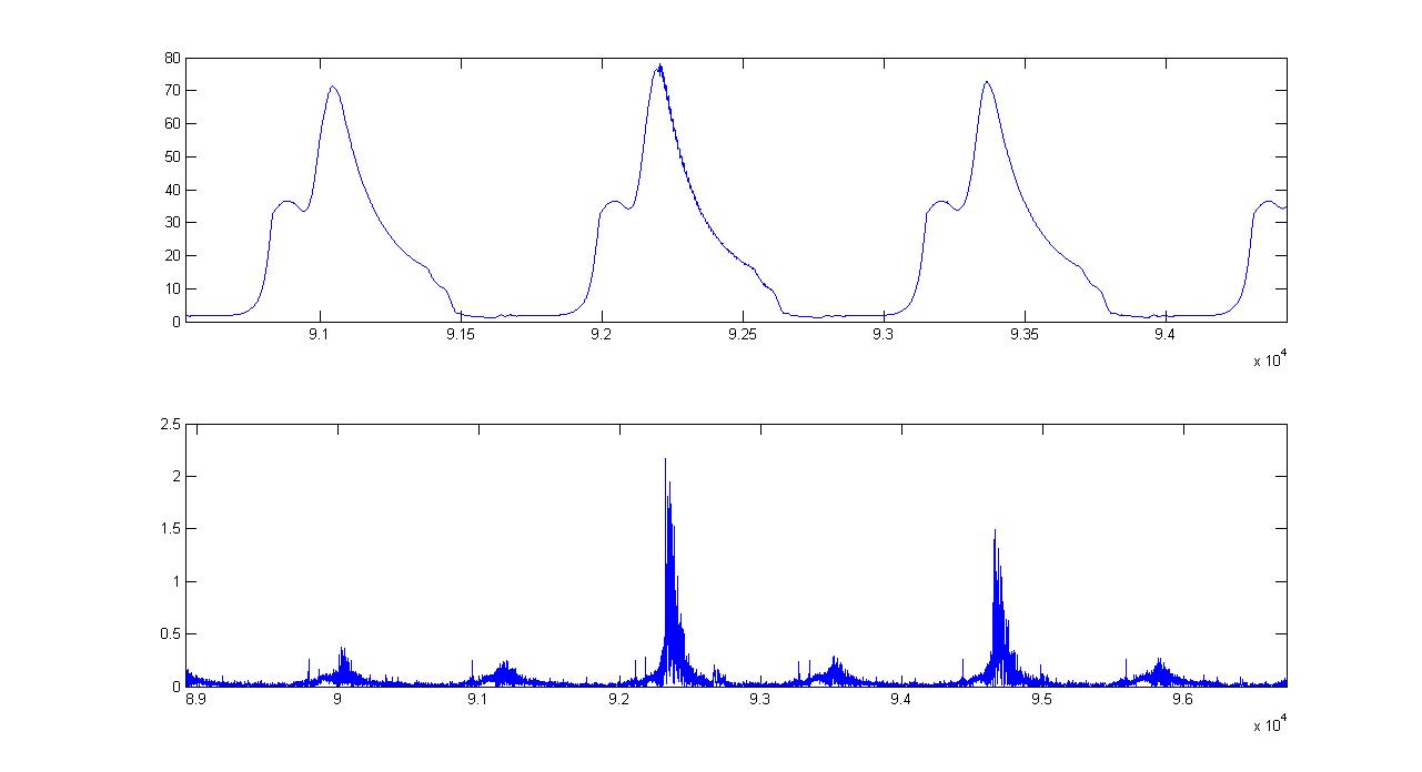 Oben sind die Druckschleifen von drei aufeinander folgenden Arbeitsspielen zu sehen. Darunter das hochpassgefilterte Drucksignale, um die für Klopfen typischen hochfrequenten Druckschwingungen zu selektieren. Was ich nun aber eigentlich nur brauch ist, für jedes Arbeitsspiel die dazugehörige maximale Amplitude. Als für Spiel 2 auf dem Bild wäre diese ca. 2,3 etc.
