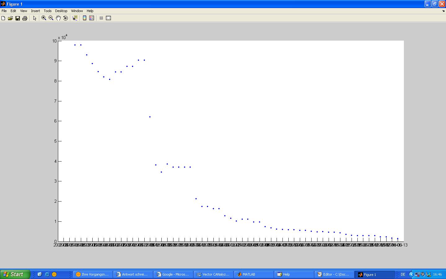 Gibts in Matlab irgendeine Funktion, die die xAchse bezogen auf die Zeit normiert? Denn die Punkte müssten ja eigentlich verschiedene Abstände haben wegen der ungleichmäßigen Daten.