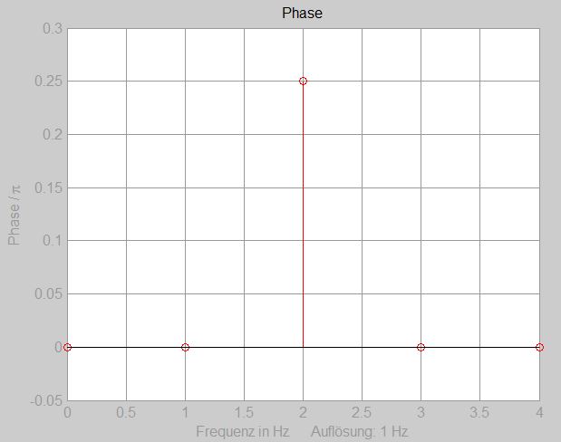 Wird für die Cosinusfunktion eine Frequenz gewählt, die zwischen den Frequenzstufen liegt, wird für alle Frequenzstufen eine Phase mit einem Wert ungleich 0 angezeigt.