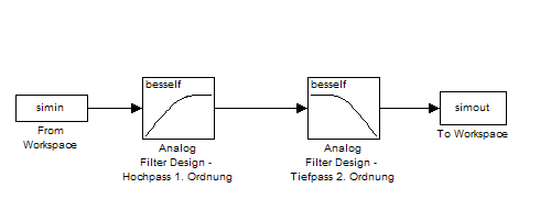 ich habe einen Bandpass aus einem Hochpass 1. Ordnung und einem Tiefpass 2. Ordnung mit dem Block "Analog Filter Design" aus dem Signal Processing Blockset aufgebaut (siehe Bild).