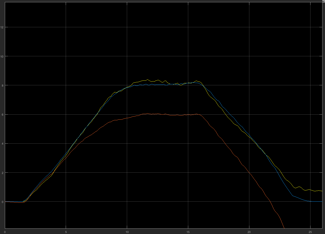 Blau=tatsächliche Geschwindigkeit Gelb= die im Offset nach oben integrierte Beschleunigung Orange=integrierte Beschleunigung |