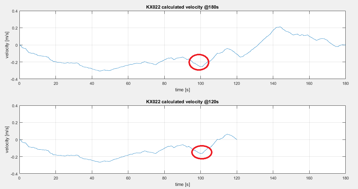 Guckt man sich die Verläufe an, welche sich für Geschwindigkeit und Position ergeben, so müsste doch (!) der Wert für (beispielsweise) die Geschwindigkeit bei 100 sekunden in beiden Verläufen (180 sekunden und 120 sekunden ausschnitt) der gleiche sein.