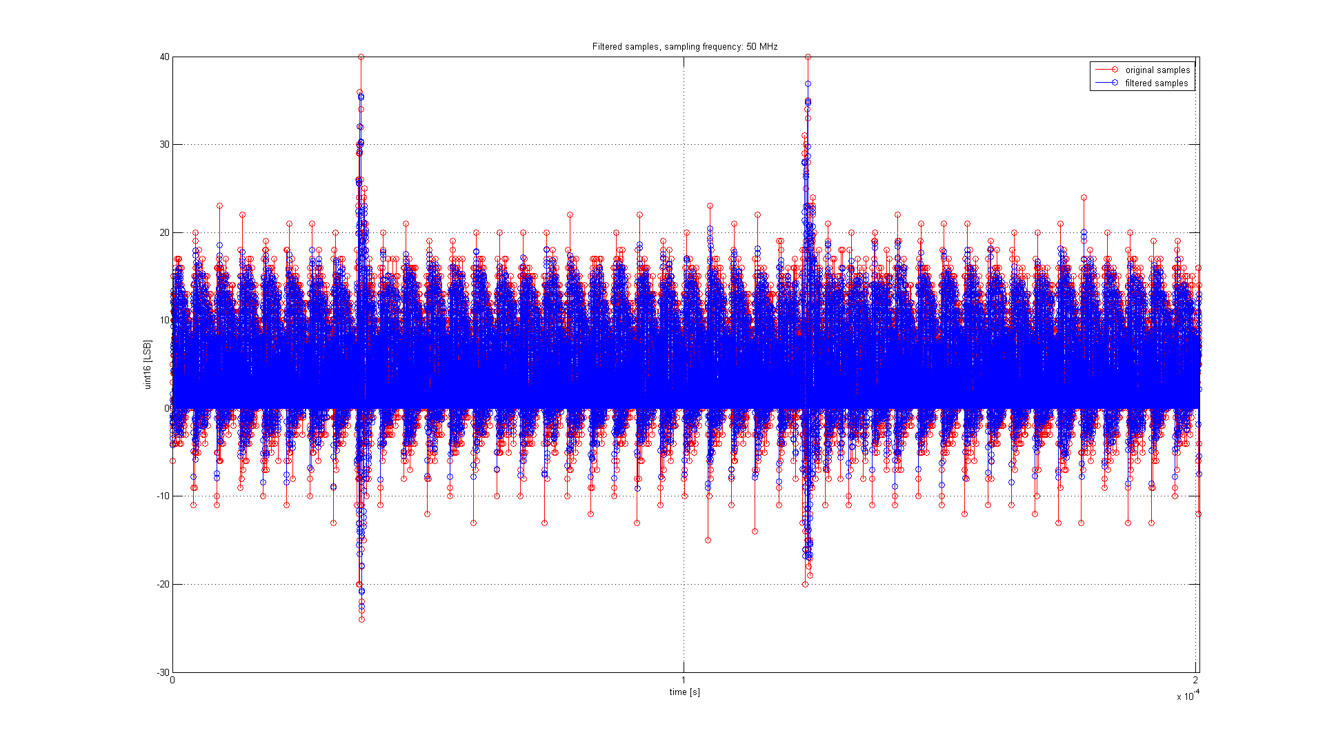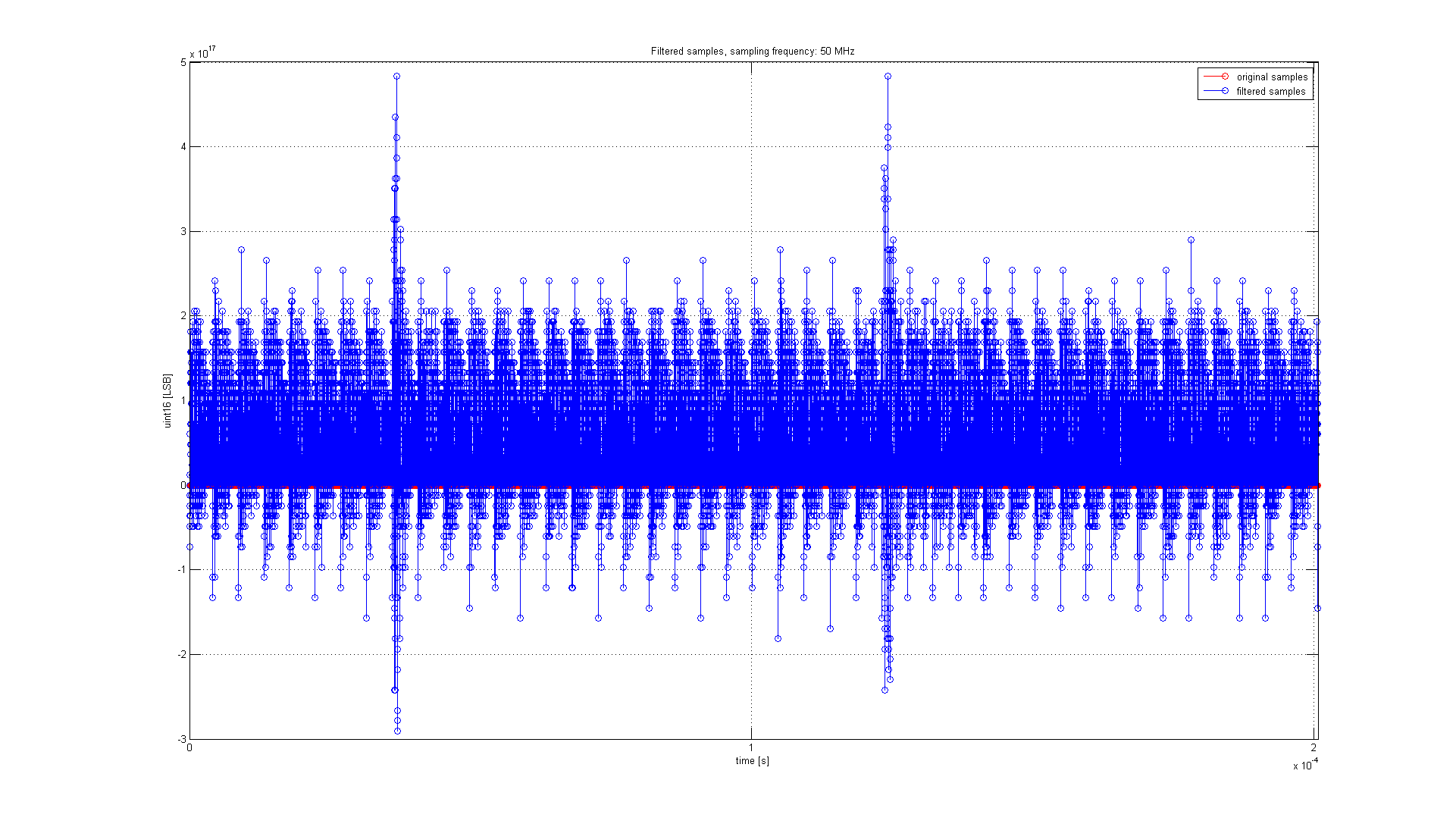 stem(t(1:16064),RX_RW_SAMPLE(1:16064),'r') hold on; grid on;