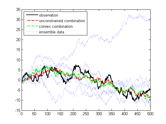 plot(time, ensemble*aFminSearch','r--','LineWidth',2) plot(time,ensemble*aFminCon','g--','LineWidth',2) plot(time,ensemble,'b:') legend('location','northwest','observation','unconstrained combination',...