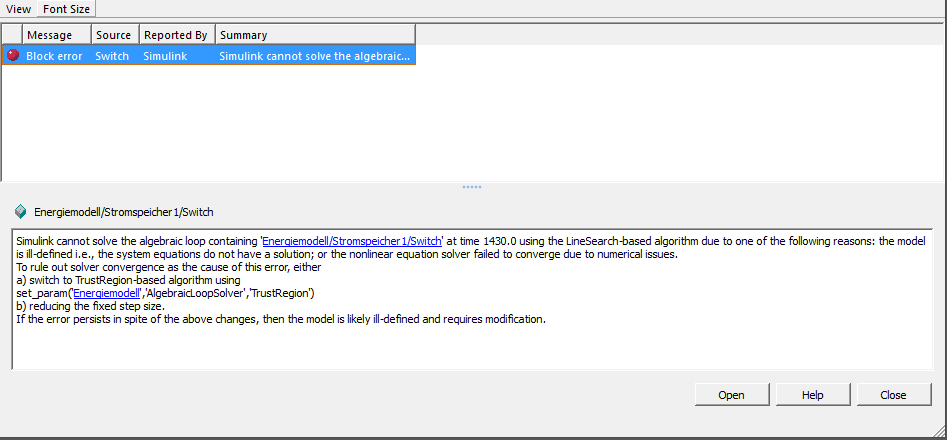 Die Vorschläge aus dem Error habe ich schon getestet. Die veränderung des Algebraicloopsolver bringt nichts und die Schrittweite zu verkleinern ist nicht möglich.