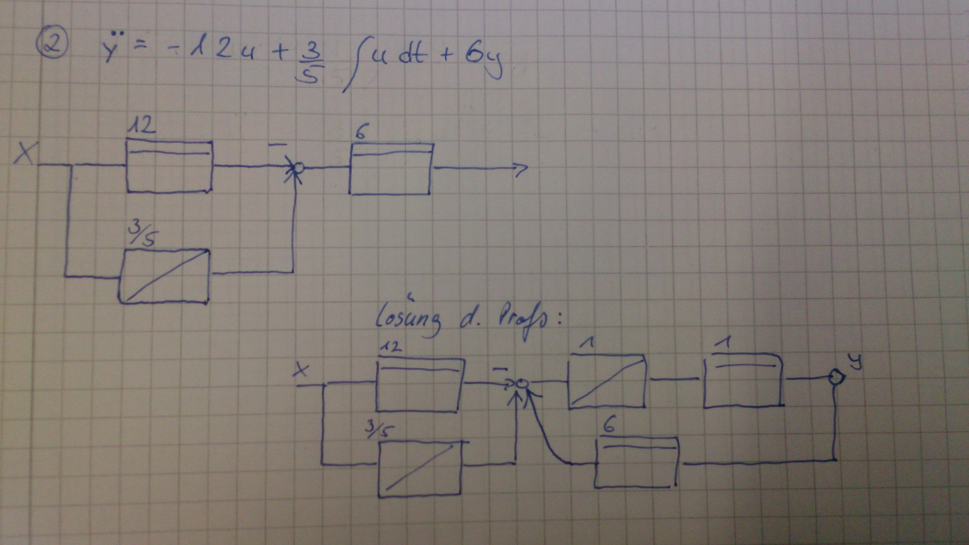 Aus folgender DGL soll das Blockschaltbild entworfen werden: y''=-12u + 3/5 $u dt + 6y