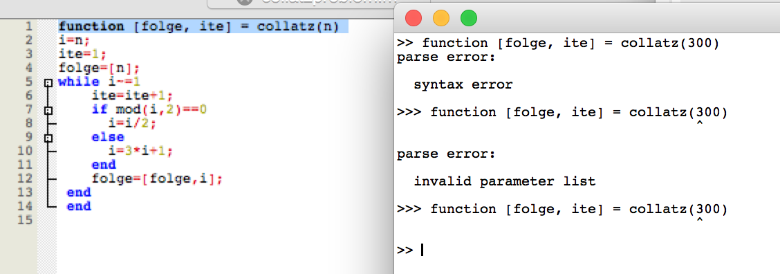 und wie lasse ich die Folge nun von 300 starten? Gebe ich nun "function [folge, ite] = collatz(300)" in das Befehlsfenster ein, erscheint ein syntax error.