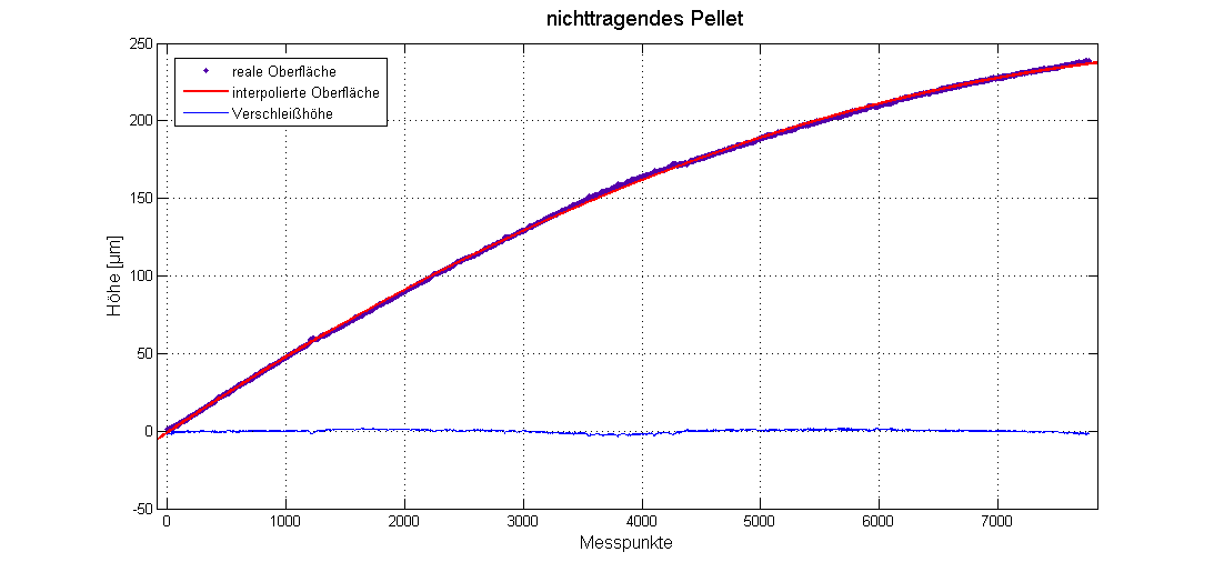 Ich habe eine Kugelförmige Oberfläche mit einem Perthometer (linear) abgefahren. Da ich den Verschleiß messen möchte, muss ich erstmal das Offset kompensieren. Hierfür erstelle ich mir eine interpolierte quadratische Kurve und ziehe das echte Oberflächenprofil davon ab. Habe dies mit einem rohen Pellet mal ausprobiert und es hat so funktioniert, wie ich mir das vorgestellt habe, siehe Bild 'nichttragend'.