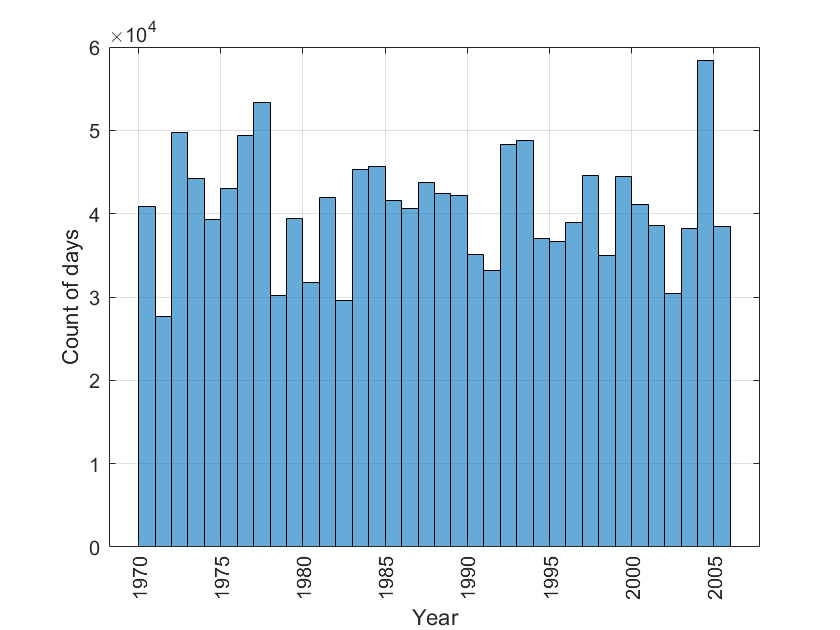 Für jedes Jahr habe ich ein Histogram erstellen könne, allerdings hätte ich dort gerne als x-Ticks nicht jedes 5. sondern jedes Jahr (1970, 1971, 1972...).