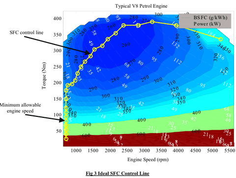 Ich möchte die Antriebsleistung eines Fahrzeugs bedienen und habe dazu ein Subsystem in das die genannte Leistung in kW führt. Innerhalb dieses Subsystems ist dann z.B. die Linie des Optimalen Verbauchs des Verbrennungsmotors hinterlegt (siehe Abb. unten gelbe Linie mit Kreisen).