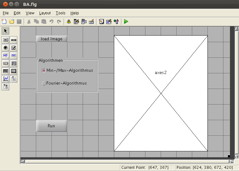 so soll es aussehen, nach betätigung von run soll der gewählte algo ausgeführt werden und das bild in axes gezeigt werden |
