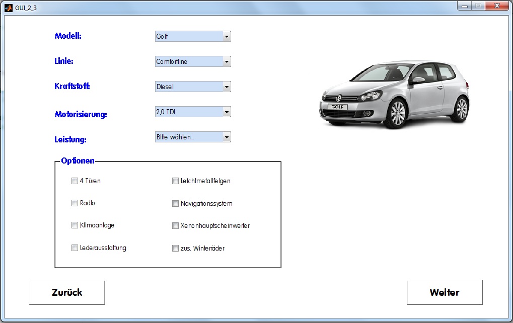 Der Benutzer soll nacheinander sein Fahrzeug mit Hilfe der verschiedenen