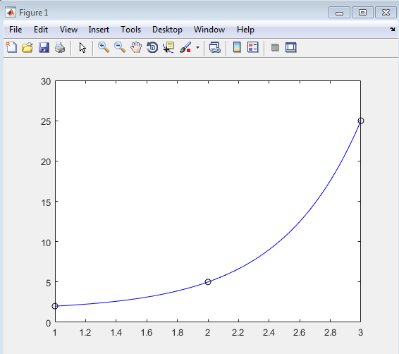 y=x(1)+x(2)*exp(x(3)*xhelp) % Plot the data and the fitted curve. plot(xdata,ydata,'ko',xhelp,y,'b-')