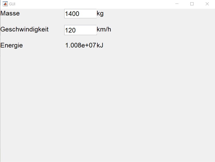 Wenn ich den Script "Energie.m" ausführe öffnet sich die GUI und gibt mir für die voreingestellten Werte die Berechnung der Energie aus. Wenn ich nun allerdings die Werte für die Masse und die Geschwindigkeit ändere, dann ändert sich nichts an der Ausgabe, das heißt die neu eingegebenen Daten werden nicht berechnet. Im Workspace sehe ich zwar, dass die Daten eingelesen werden, jedoch geschieht weiter nichts. Wo ist mein Fehler?