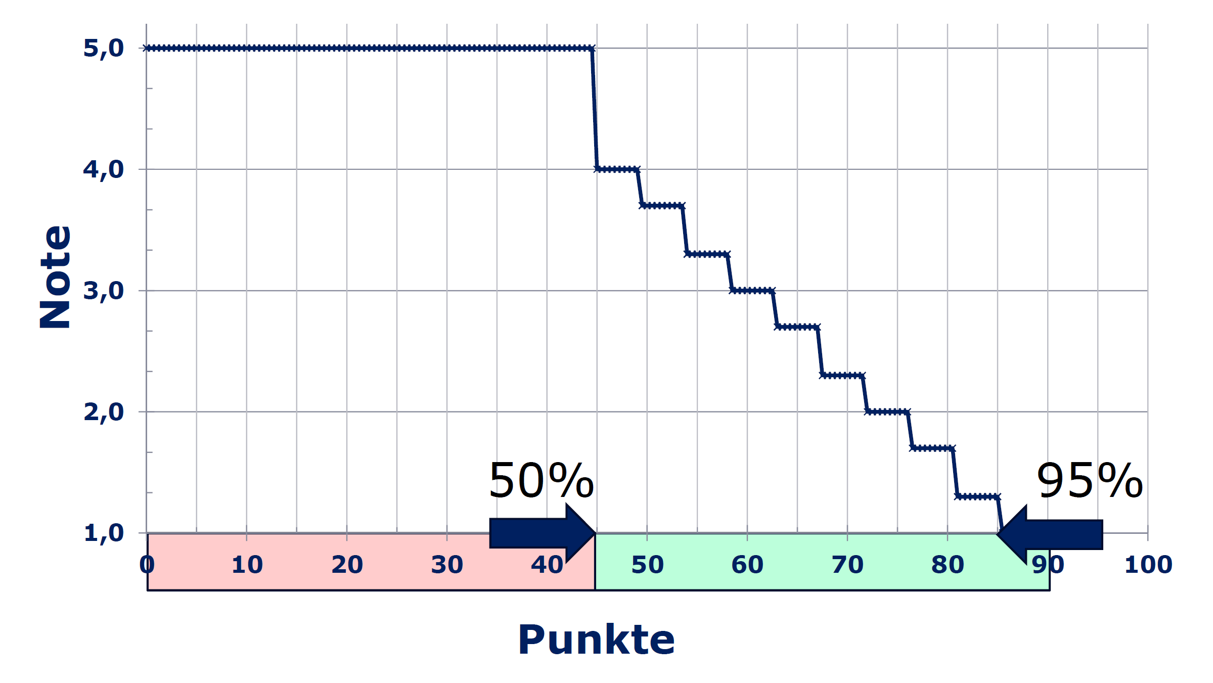 die Noten (generell, nicht die Anzahl) mit den Zwischenschritten: 5.0; 4.0; 3.7; 3.3; 3.0; 2.7; 2.3; 2.0; 1.7; 1.3 und 1.0 sowie die Punkteverteilung (z.b. 0-44 Punkte ergibt Note 5.0) sind gegeben.