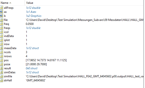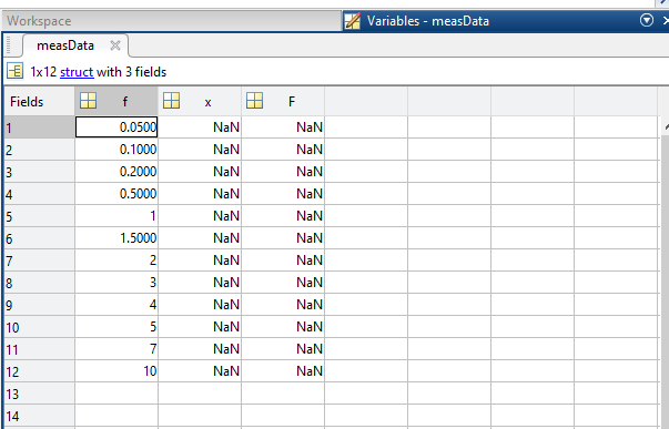wie gesagt, mein Code plottet mir die Werte nicht in die Diagramme. Er bringt beim ausführen des Programm die Plottseite (Einteilung der Seite in Spalten und Reihen usw.) aber die Plots sind leer. Es liegt daran das die Messdaten von der CSV Datei nicht eingelesen werden, was man im 2ten Bild von meinem Beitrag sehen kann (x und F Werte sind NaN). Hab jetzt mal eine Spalte der CSV.datei in einer Textdatei hochgeladen. Dort sind für eine Frequenz die Verschiebung mit der dazugehörigen Kraft dargestellt.