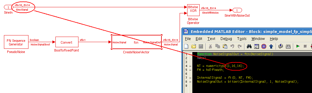 Zum angehängten Bild: Ich hätte gerne, dass der Ausgangsdatentyp des CreateNoiseVector-Blocks automatisch auf den Datentyp des SineSignal-Signals gesetzt wird.