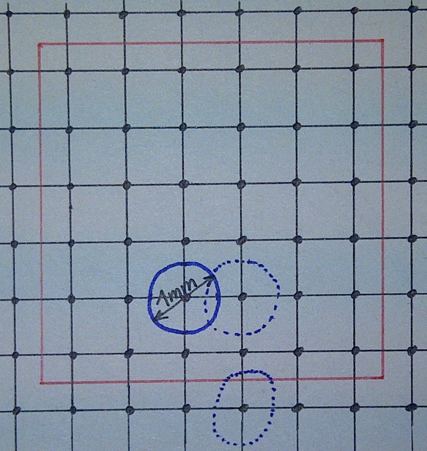 Zur Erklärung habe ich nun eine Zeichung beigefügt. Dabei steht das in Schwarz gezeichnete Gitternetz für die Verfahrwege der Sonde, die schwarz markierten Punkte stellen die Orte dar, an denen Messpunkte aufgenommen werden. Alle Punkte haben dabei sowohl in x- als auch in y-Richtung einen Abstand von 0,75 mm. Die Sonde hat einen Durchmesser von 1 mm, es kommt also zu einer Überlappung der Messfläche von Messposition zu Messposition (wie ich es mit dem durchgehenden blauen und dem gestrichelten blauen Kreis angedeutet habe, die sich überlappen). Die rote Linie soll - ideal gedacht - die äußere Grenze des strömenden Fluides darstellen. Auch außerhalb der Strömung gibt es Messpunkte, fährt man einen solchen mit der Sonde an (unterer blau gestrichelter Kreis) kann es passieren, dass der eigentliche Mittelpunkt der Sonde (also auch mein späterer Ergebnispunkt) außerhalb des Fluids liegt, aber durch die Größe des Sensors wie gezeigt der Randbereich der Strömung noch erwischt wird. So bekomme ich für einen Messpunkt außerhalb der Strömung noch einen gewissen Impulswert. Das habe ich damit gemeint, dass meine tatsächliche Impulsverteilung in die Breite bzw. in die Länge gestreckt wird, da ich für Punkte außerhalb der Strömung noch Werte erhalte.