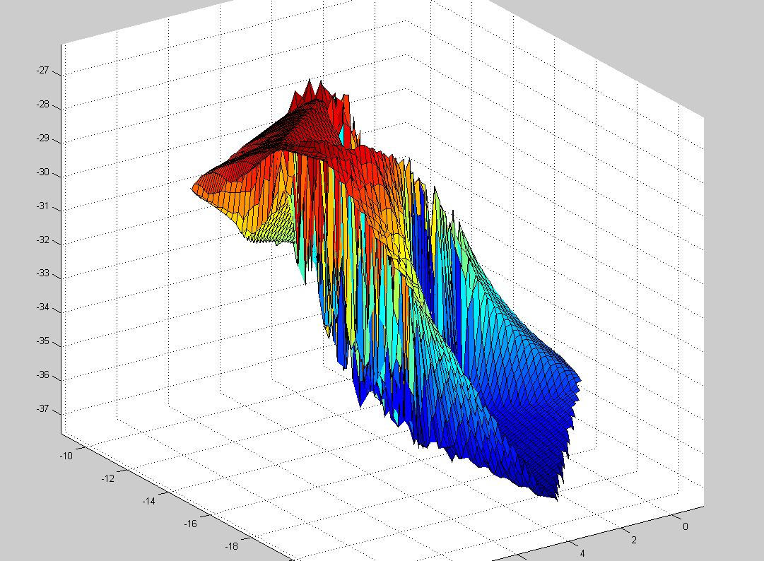 Ein Problem, das ich sehe: du hast teilweise zu einem x-y - Paar zwei z-Werte. Mit der momentanen Vorgehensweise ist das nicht möglich. Ich würde versuche, die Daten in (min.) zwei Teile aufzuspalten, so dass z wirklich als Funktion von x und y aufgefasst werden kann.