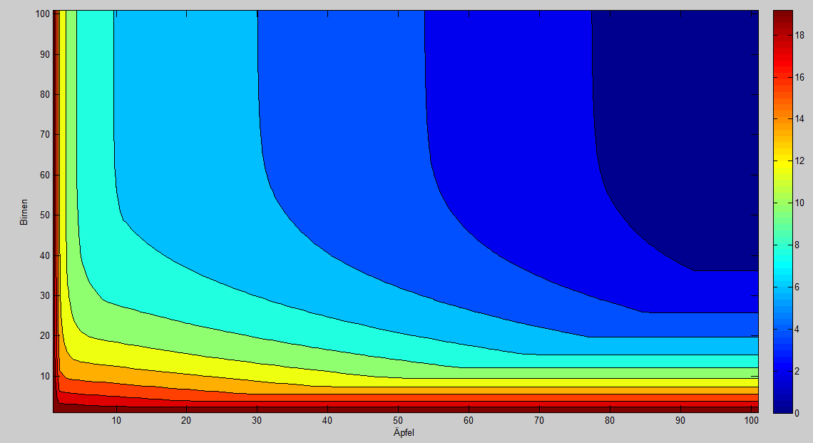 "contourf" zeichnet die Grafik und "colorbar" setzt farbliche Skalierung (rechts im Bild). Mein Problem ist, dass ich mit "contourf(A, 10)" nur zenh verschiedene Farben mache, aber "colorbar" macht das komplette Farbspektrum Wie kann ich dem "colorbar" sagen, dass er die gleichen 10 Fahben macht wie "contourf" ?