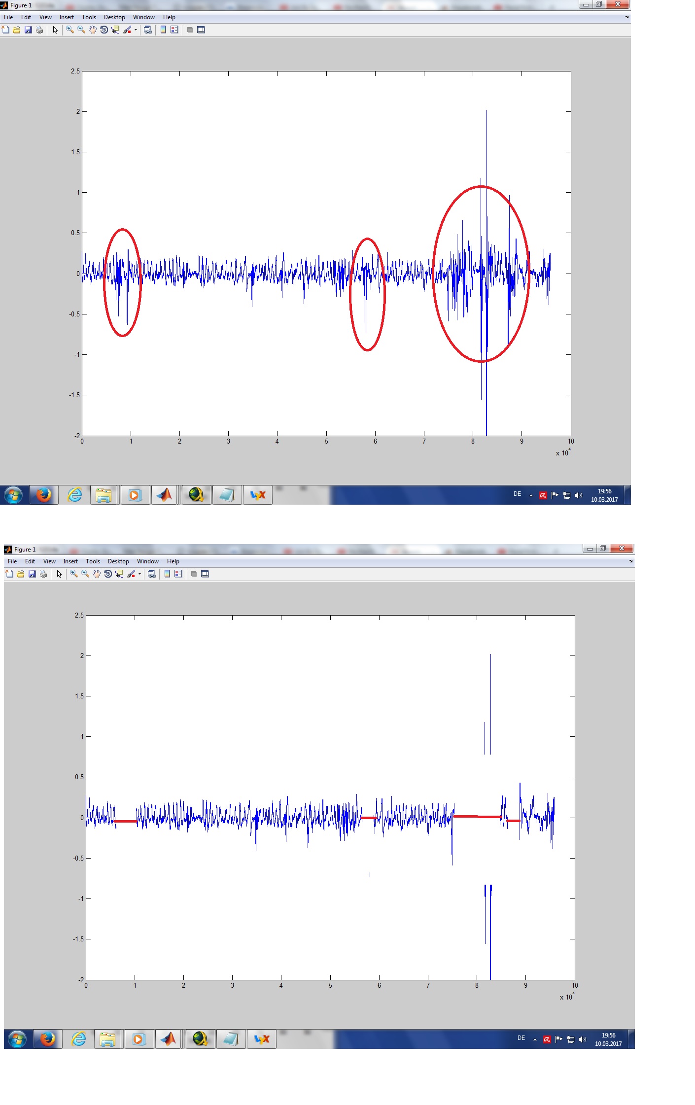 arbeiten, um die Ausschläge zu erkennen. Alle Peaks, die über einem Schwellwert liegen, dann aus den Messdaten entfernen + weitere Punkte in der Umgebung der Peaks liegen. Ggf. kann es auch nützlich sein den Verlauf zu glätten über