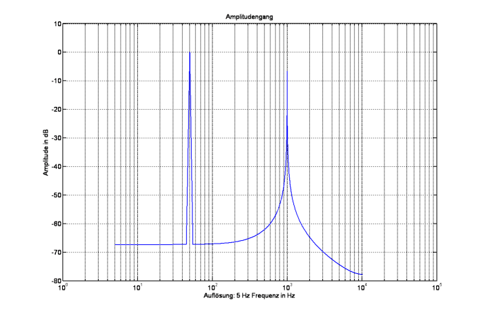 Das verstehe ich jetzt nicht...du hast Fa = 20480 Hz und verwendest 4096 Messwerte. Somit hast du eine 2er Potenz und kannst die FFT benutzen und hast deine Auflösung von 5 Hz. Ein Nutzsignal von 50 Hz würde somit auch mit voller Periodenanzahl in das Fenster passen -> kein Leakage. Wenn dein Signal nun aber weitere Anteile enthält, deren Perioden nicht ganz ins Fenster passen, entsteht dort der Leakage-effekt. Man bezieht das oft auf die ganze Anzahl von Perioden um den Effekt zu erklären. Hiermit wird es evtl. etwas eindeutiger...ALLE Frequenzen in deinem Signal, die kein ganzzahliges Vielfaches von 5 Hz haben, werden nicht sauber im Spektrum dargestellt. Hier tritt dann das Verbreitern des Spektrums (Verschmieren) um die Signalfreq. auf. In dem Bild siehst du ein 50 Hz Grundschwingung und eine Oberschwing. von 1001 Hz. Die Darstellung ist etwas ungenau durch die log. Skalierung...aber so sieht man es besser. Bei 50 Hz tritt kein Leakage auf (auch wenn das hier evtl. den Anschein hat) aber bei den 1001 Hz ist es sehr deutlich zu sehen. Ich hoffe damit ist es klar geworden.