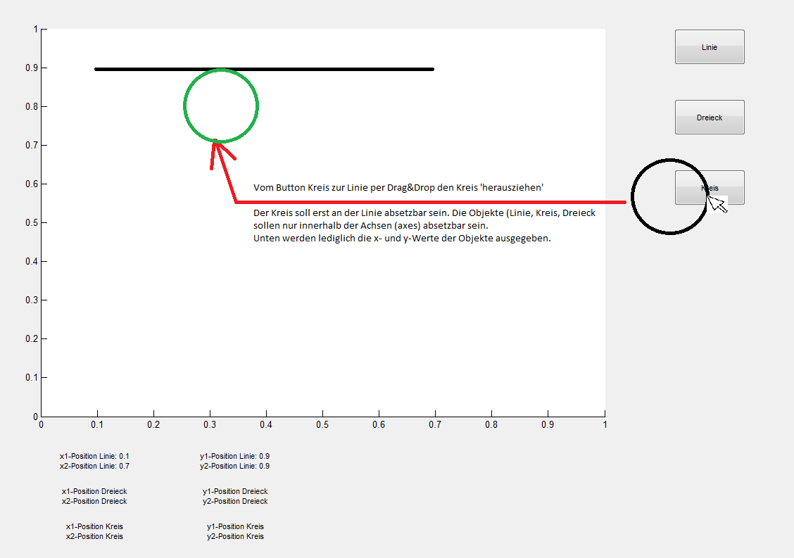 Ich möchte gerne in der Gui (also auf meinem Hauptfester der figure) drei Elemente als static text oder Button haben, die dann heißen sollen: Linie, Dreieck, Kreis. Wenn jetzt der Nutzer per Drag and Drop ein Element sich greift (bspw. zuerst die Linie), dann möchte ich, dass er diese frei in einem definierten Zeichenbereich platzieren kann.