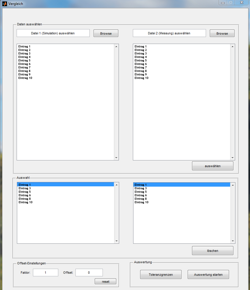 Das Hauptfenster der GUI besitzt eine listbox in der eine struct mit vielen verschiedenen Messreihen eingeladen wird (>100). Es gibt dann eine zweite listbox, die leer ist und durch markieren von Messreihen aus der 1. Listbox aufgefüllt wird. Anschließend wird die Berechnng gestartet.