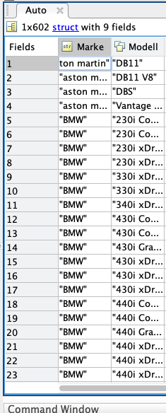 Und zwar muss ich in GUI eine Liste (POPUPMENUE) erstelll, um auszusuchen welches Baujahr auserwählet werden soll und in der 2019.mat Datei sind dieAutos mit Marken, und Models .