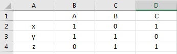 Meine Idee zur Umsetzung des Vorhabens ist, in Excel eine Relationstabelle zu erstellen, welche die Varianten als Zeile, bzw. Spalte gegenüberstellt und über 0- und 1- Einträge miteinander verknüpft, bzw. ausschließt. (Siehe Beispieltabelle.jpg)