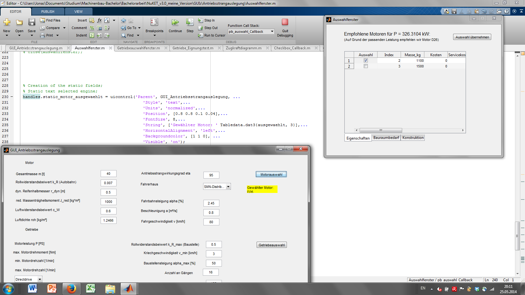 Man sieht rechts die GUI namens 'Auswahlfenster', welche durch einen Klick auf den 'Motorauswahl' Button in der GUI 'GUI_Antriebsstrangauslegung' erzeugt wurde.
