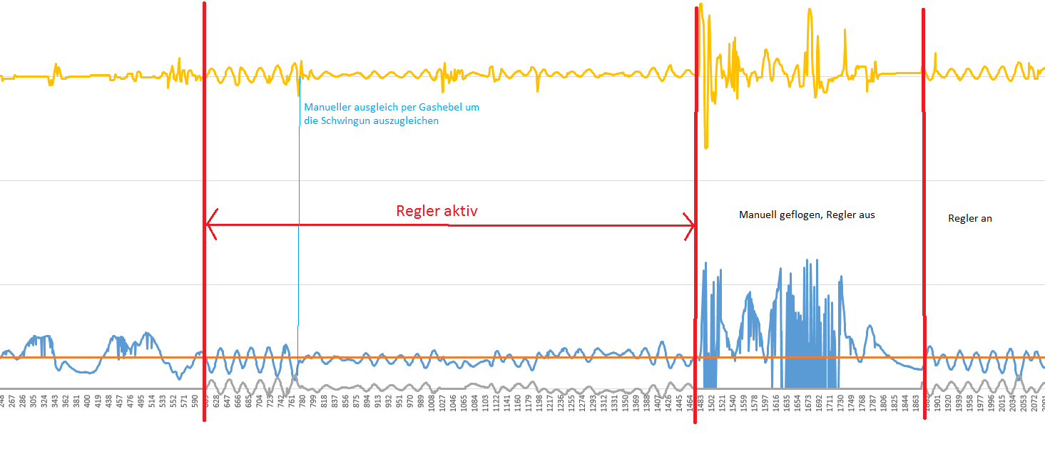 Flugdaten mit zu hohem P Wert, I und D =0 Gelb: Gaswer, Blau: Höhe, Grau: Reglerausgang |