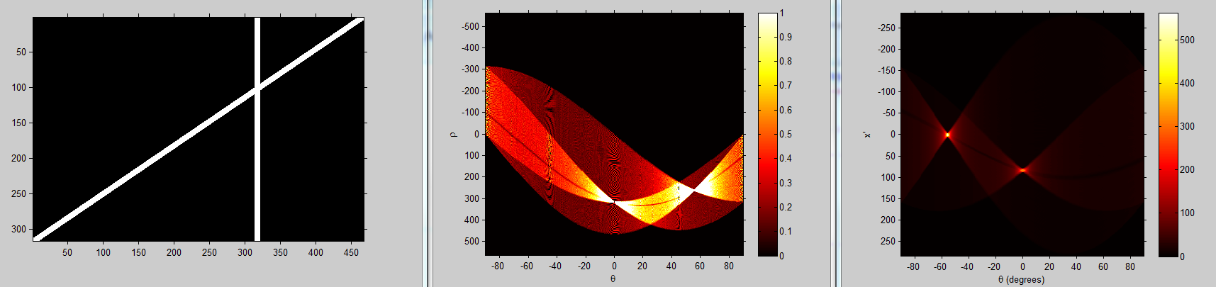 Mittlerweile bin ich dank dieses Beispiels, das die Hough-Transformation anders implementiert als die MATLAB-eigene Funktion soweit gekommen, dass ich darstellungstechnisch zwei sehr ähnliche Diagramme plotten konnte.