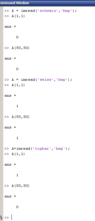 habe jetzt deine Bilder mit IMREAD eingelesen, bekomme ich bei topbar.bmp auch diesen Effekt: Oben 1 unten 0, während bei tophalf.bmp Oben 0 unten 1 sind.