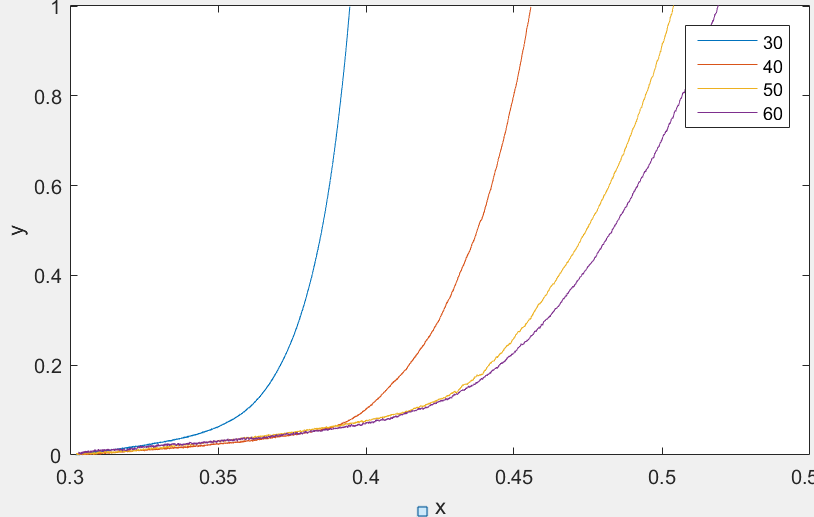 Bisher habe ich Messungen bei vier verschiedenen Temperaturen gemacht (siehe Bild). Die Temperatur während einer Messung bleibt jeweils konstant. Gemessen werden die Werte für x und y.