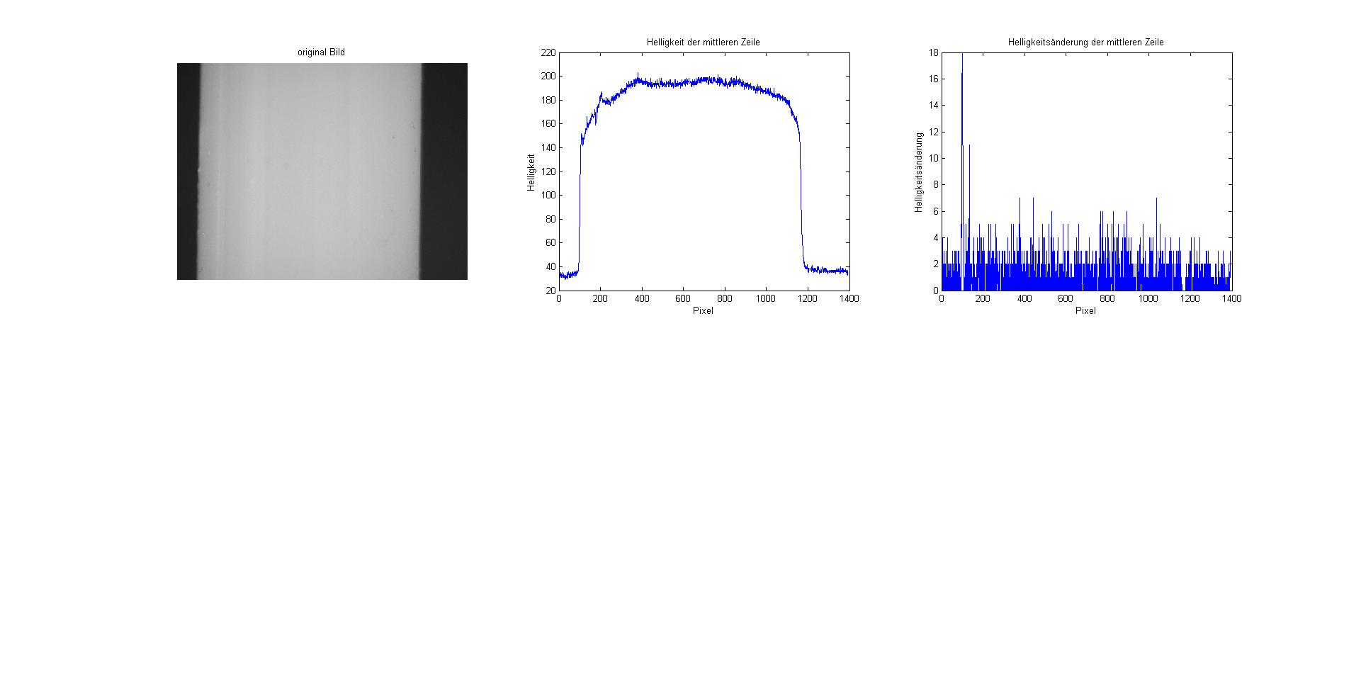 Bei einer "Papier und Bleistift" Lösung hätte ich ein Maximum der Ableitung ca. bei Pixel 100 und ein Minimum der Ableitung bei ca. 1150 erwartet. Leider sieht die Ableitung der Helligkeit sehr hässlich aus.