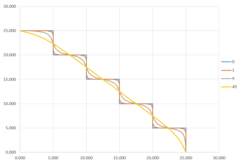 Die angehängte Abbildung zeigt zunächst einen Verlauf aus mehreren linear verlaufenden Funktionen. (blau - 0). Die Linearfunktionen würden im 3D aus fest definierten Stützpunkten resultieren.