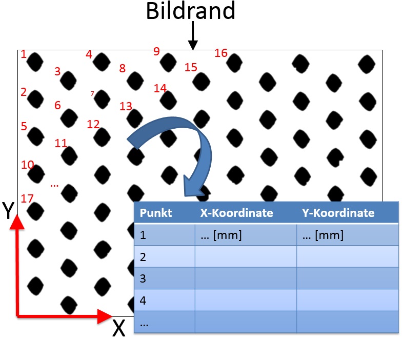Ein Bild (schwarz-weiss, dpi: 300) enthält mehrere unterschiedliche schwarze Flecken. In einer definierten Reihenfolge soll von jedem Fleck der Flächenschwerpunkt bestimmt und als Koordinate (X und Y in mm) gespeichert werden (siehe hierzu Bild in Anlage!)