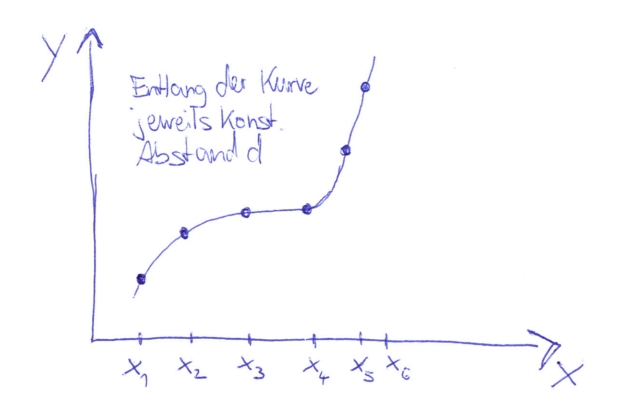 ich möchte Messpunkte (x1, x2, ..) mit äquidistantem Abstand d (bezogen auf den Kurvenverlauf) bestimmen (s. Grafik).