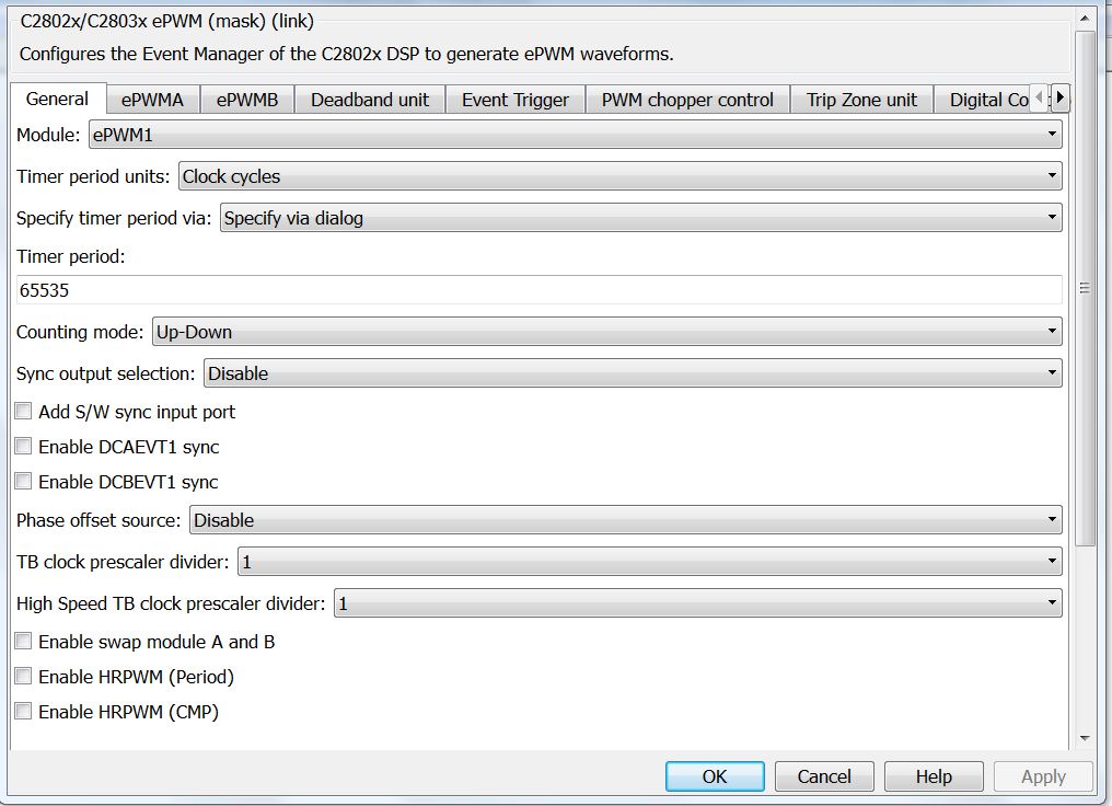 ich möchte gerne eine von außen einstellbare PWM von 10Hz bis 100kHz programmieren. Hierzu benutze ich das ePWM-Modul (siehe Anhang) in Simulink und später noch ADC-Module um die Frequenz von "außen vorgeben zu können (Feineinstellung, Grobeinstellung). Leider ergibt sich ja meine minimale PWM-Frequenz aus Taktfrequenz des µC (60MHz), Zählmodus (up-down), Zählervorgabe (max=65535) und Precaler (1) - somit eine minimale Frequenz von 457Hz! Leider kann man den Precaler während des Betriebs nicht ändern (so wie z.B. die Timer-Period), so dass ich jetzt nicht weiß ich die Frequenz weiter herunter bekomme im Betrieb. Hat jemand damit evtl. Erfahrung?