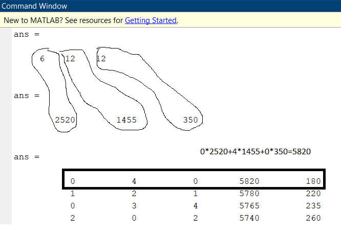 Diese Matrix wird zeilenweise gelesen. Der erste Eintrag ist die Anzahl der Teillänge 2520mm, der zweite Eintrag die Anzahl der Teillänge 1455mm und der dritte Eintrag die Anzahl der Teillänge 350. Der vierte Eintrag ist dann die Summe der Teillängen und im fünften Eintrag der übrige Rest, also 6000-5820=180. Also 0*2520mm+4*1455mm+0*350mm=5820mm