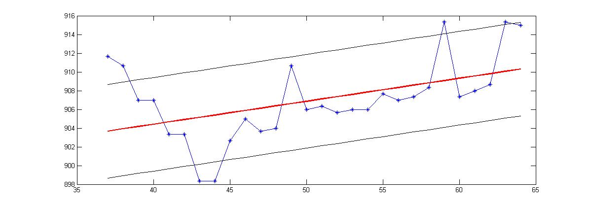 Ich plotte eine Reihe von Messpunkten. Anschliessend definiere ich eine Regressionsgerade die durch die Punkte geht und gleichzeitig definiere ich einen Bereich oberhalb und unterhalb der Regressionsgerade (Bild1).