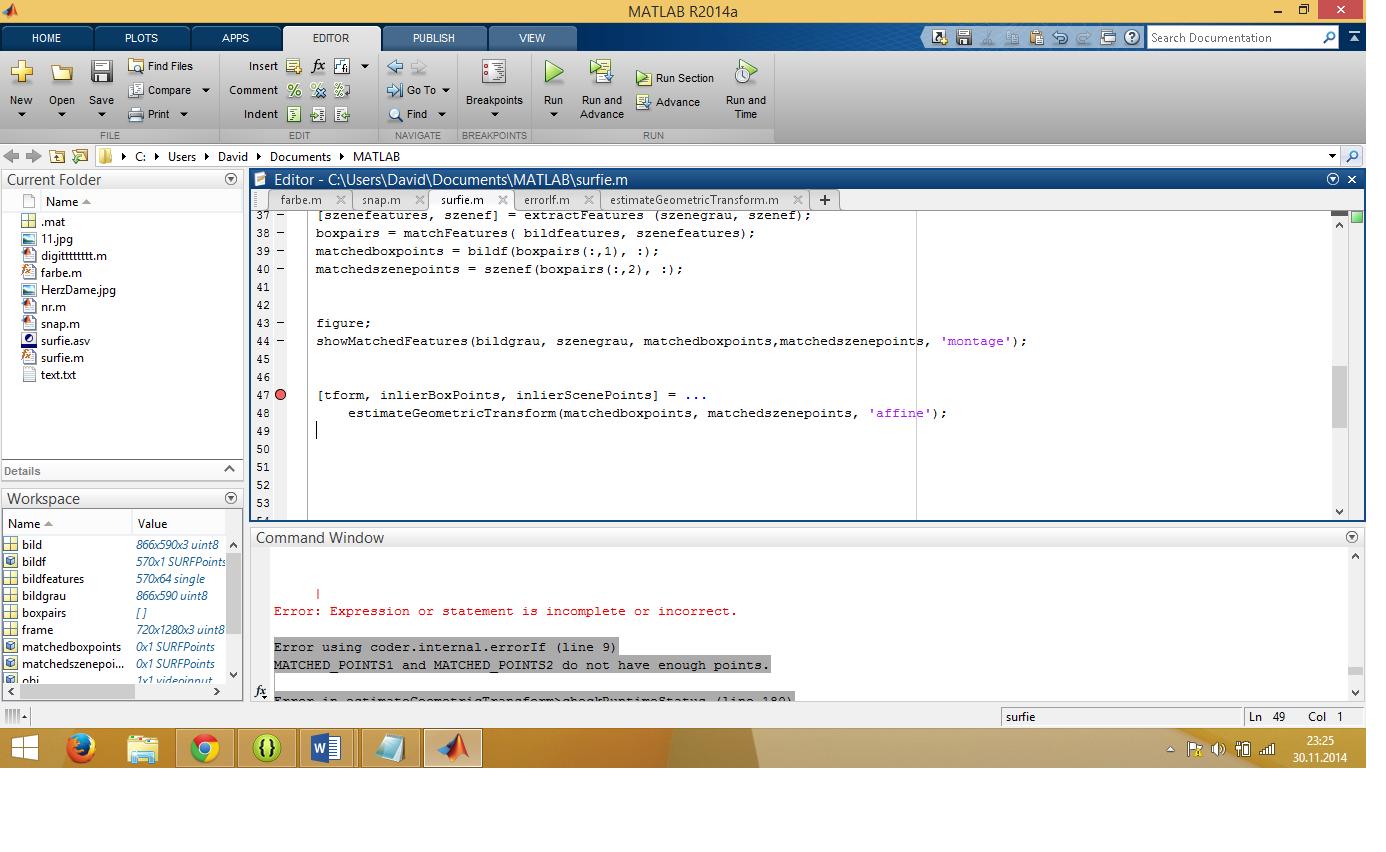 Was ich nicht verstehe...erst schreibst du, der Algorithmus würde tadellos funktionieren. Aber wenn du einen Breakpoint setzt, gibt es eine Fehlermeldung bei genau besagter Funktion. Ergo ist der Input zu estimateGeometricTransform nicht korrekt, weshalb die Funktion eine Fehlermeldung liefert und das Programm abbricht.