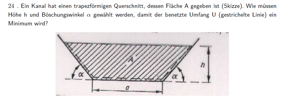 Wenn die Fläche nicht constant bleiben müsste, könnte man alpha=90° und h=0 LE wählen. Dann wäre der Umfang minimal, aber die Fläche gleich 0.
