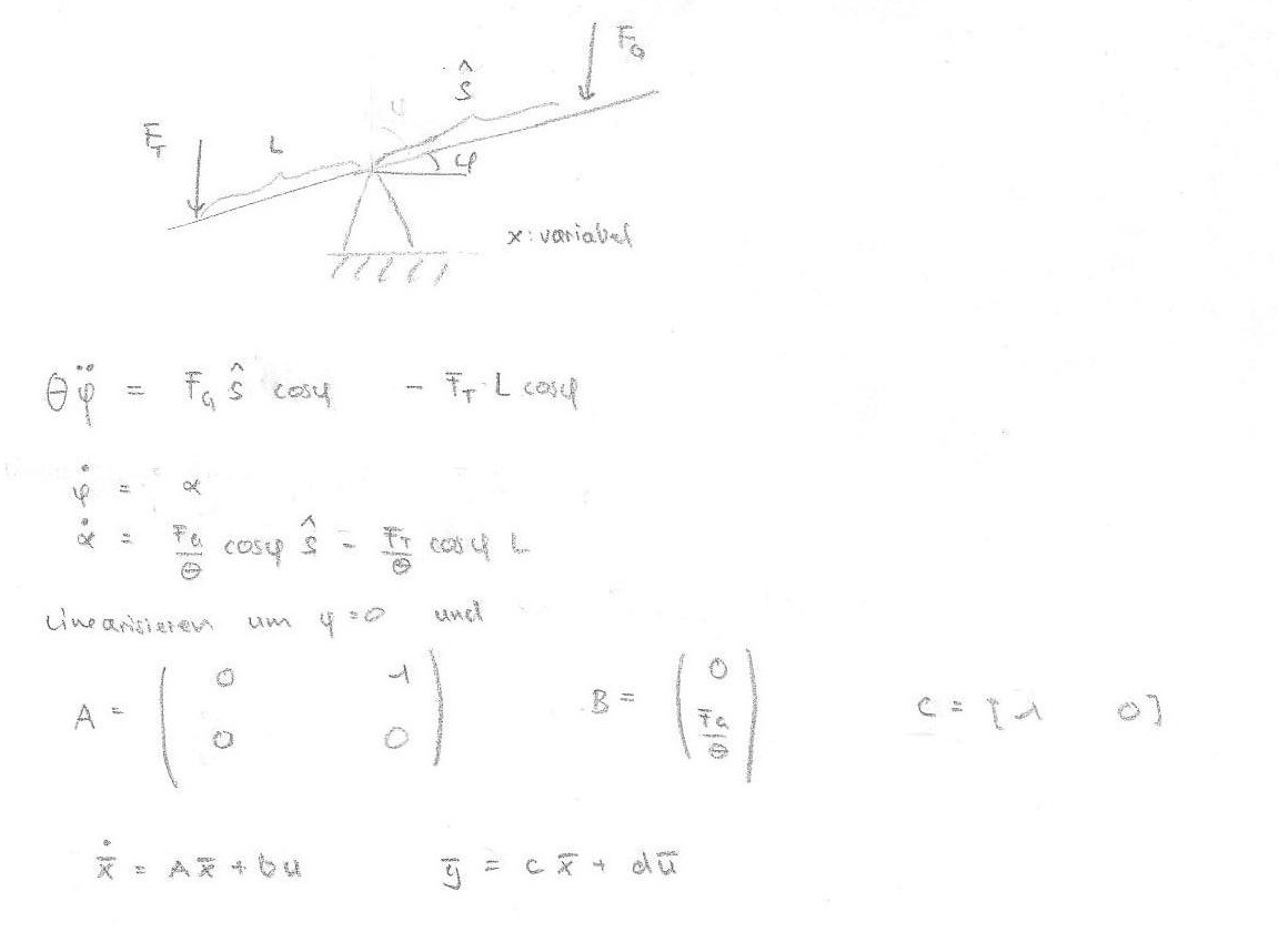 Auf der anderen Seite ist ein Wassertank (von mir vereinfacht mal eine Kraft) die mit einer bestimmten Geschwindigkeit zu/bzw abnimmt in Abhängigkeit des Winkels der Wippe, so dass alles in der Waagerechten ist.