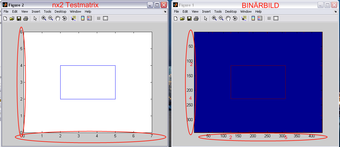 Das Zweite, was mir aufgefallen ist bei dem Code: Wenn ich die Testmatrix in das Binärbild übertrage, dann sollten auch die Axen Werte gleich sein (siehe Anhang).